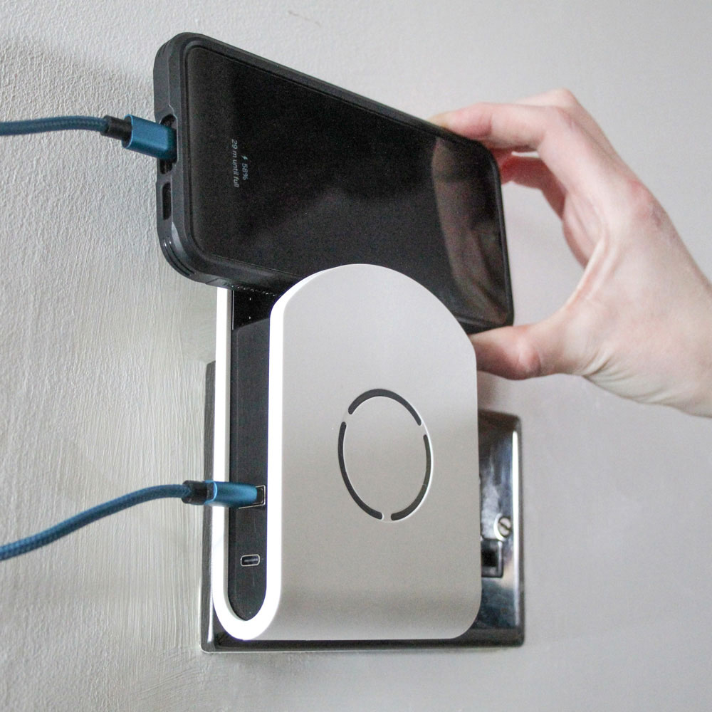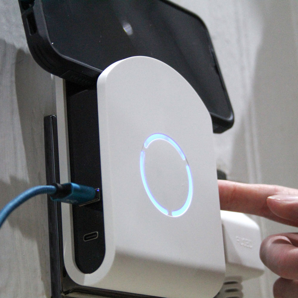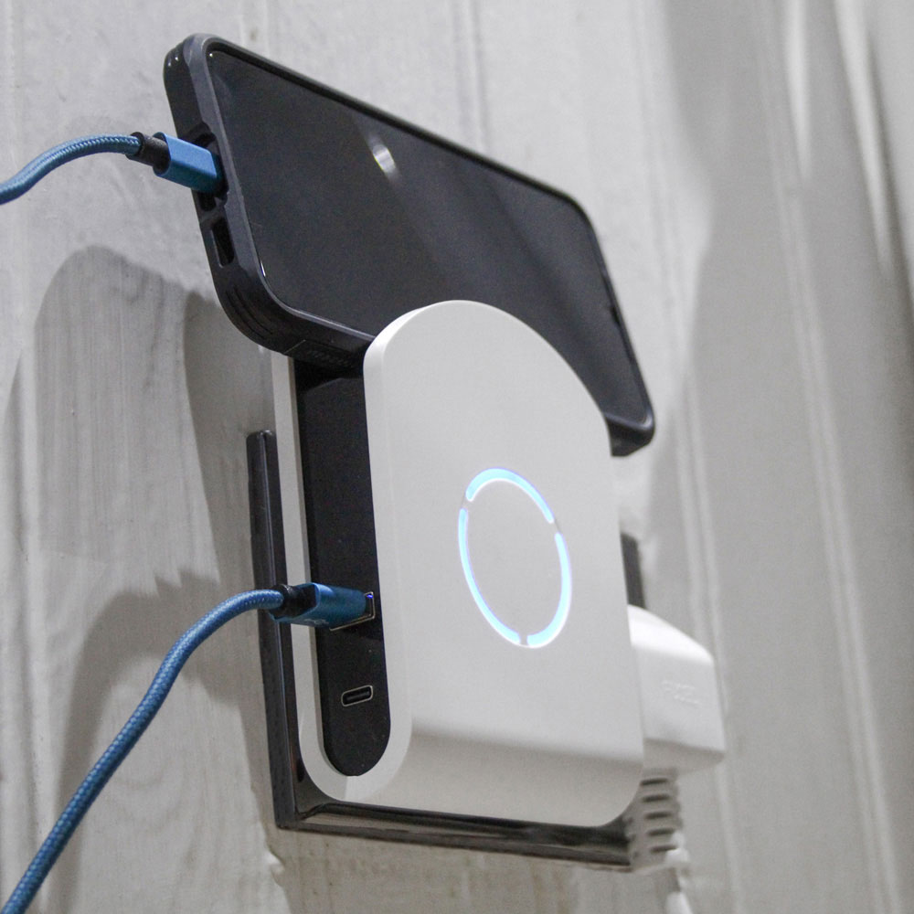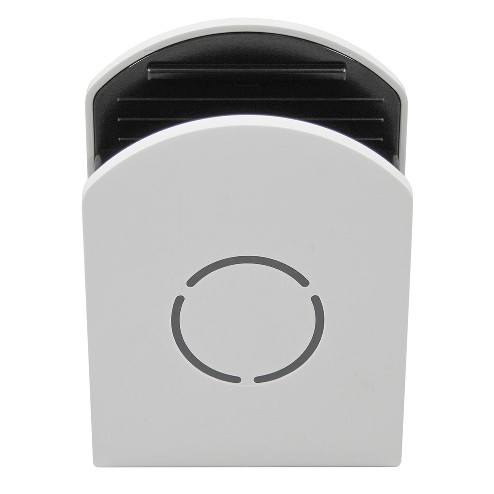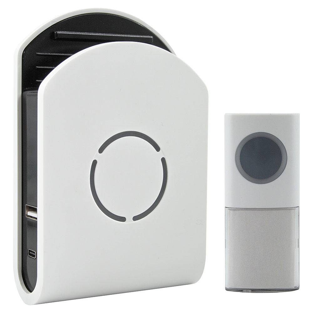 Wire-free door chime with USB charging sockets and mobile phone holder. Simply plugs into any 13A socket around your home and is wireless, so no wiring is required, and with an extensive operating range of up to 200m, you never have to miss a visitor or delivery.
